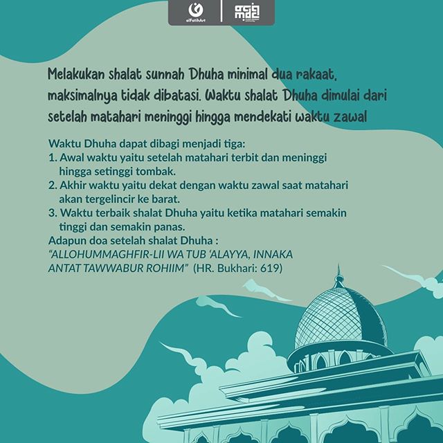 Aktivitas pada Waktu Pagi: Melakukan shalat sunnah Dhuha minimal dua rakaat, maksimalnya tidak dibatasi. Waktu shalat Dhuha dimulai dari setelah matahari meninggi (15 menit setelah matahari terbit) hingga mendekati waktu zawal (15 menit sebelum Zhuhur)